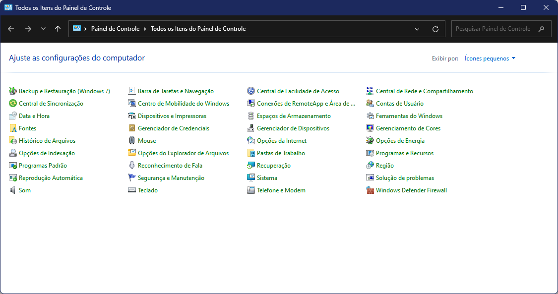 Abra o Painel de controle do Windows, não esqueça de alterar o Exibir por: Ícones pequenos: